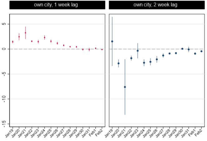 上图的系数反映了来自武汉的人口流入对于疫情传播的影响,佐证了使用人口流动数据来预测疫情风险的合理性。比如,左图第一个数值是0.0049,这表示如果从武汉到某城市的迁徙指数是100,武汉每周平均多增加1个病例,会导致这个城市的病例数在一周内平均增加个。这个数值是由1月19日(横轴的日期)开始的14天样本估计的。图中还标注了95%置信区间。根据总出行人数估算,1万人的迁徙指数是。因此一个粗略的估算是如果从武汉到某城市平均每周有1万人,武汉每周平均多增加1个病例会导致该城市在一周内平均增加个病例。左图反映了1周的滞后效应,右图反映了1-2周的滞后效应。