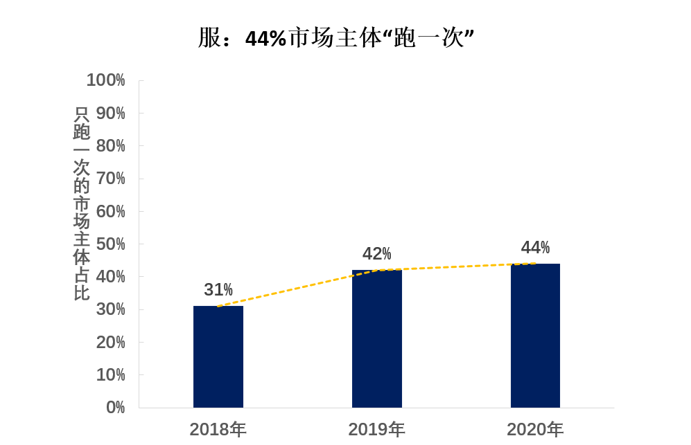 从优化政务服务来看,办事效率显著提升。2018年调研中,全国有31% 的市场主体办事 “最多跑一次” 。到2020年时,“最多跑一次”的比例增加到 44% 。一窗受理、集成服务,是推进实现“最多跑一次”目标的具体举措,调研显示约七成市场主体办事已经实现了“一窗办理”。