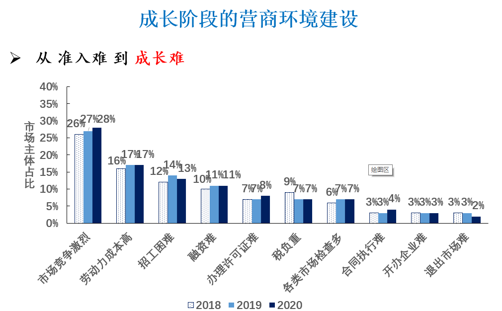 当前市场主体面临的主要困难从与政务服务相关的“准入难”转变到植根于市场供需层面的“成长难”,这对成长阶段的营商环境建设提出了新的改革要求。在成长阶段,市场主体面临的主要问题是“竞争激烈”、“招工困难”、“融资困难”、“办证难”,相对应的改革工作重点是扶持市场主体成长和高质量发展,通过 “提升政务服务 ” 与 “开放市场领域”的组合拳,助力不同市场主体的成长和转型,尤其是小微企业的成长,持续释放市场活力,促进经济高质量发展。