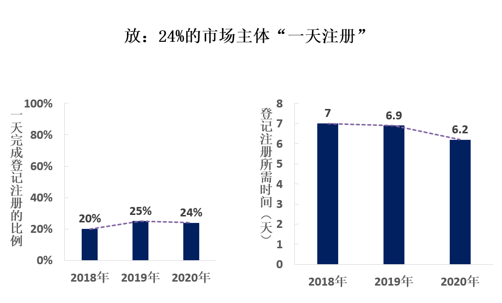 当前“放管服”改革进展显著。从放宽市场准入来看,24%的市场主体“一天注册”,完成登记注册所需的平均时间下降到6.2天。办证时间方面, 办理最耗时许可证所需时间也呈现明显的下降趋势 , 从2018年的平均27.9天降到 2020年的平均17.7天。