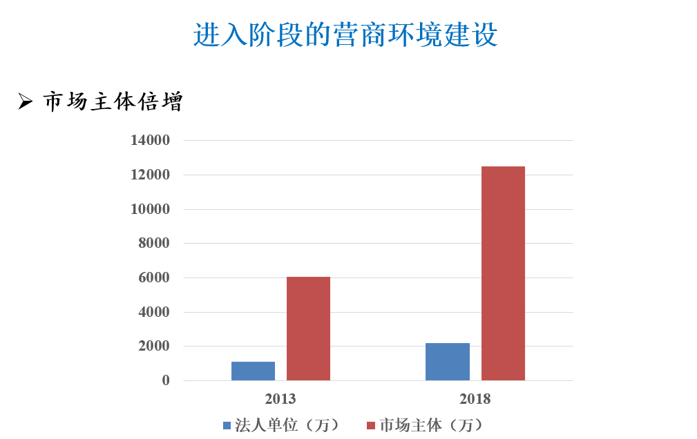 在市场准入阶段,市场主体面临的主要问题是“准入难”和“准营难”,相对应的改革目标是缩短市场主体办理准入业务的时间和减少办证数量,改革的成效是市场主体倍增,增加了就业岗位。数据显示自2013年到2018年市场主体增加了6000万左右。
