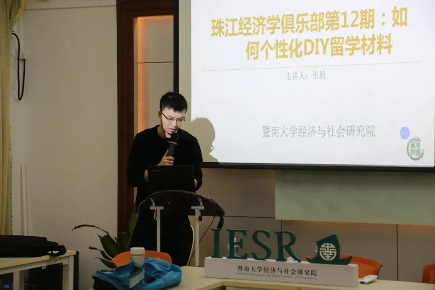 10月22日下午,暨南大学经济与社会研究院珠江经济学俱乐部系列讲座第十二期暨IESR职业发展规划系列讲座第一期在中惠楼106室举行。IESR助理教授张毅为学生们带来了主题为“如何个性化DIY留学申请材料”的讲座。