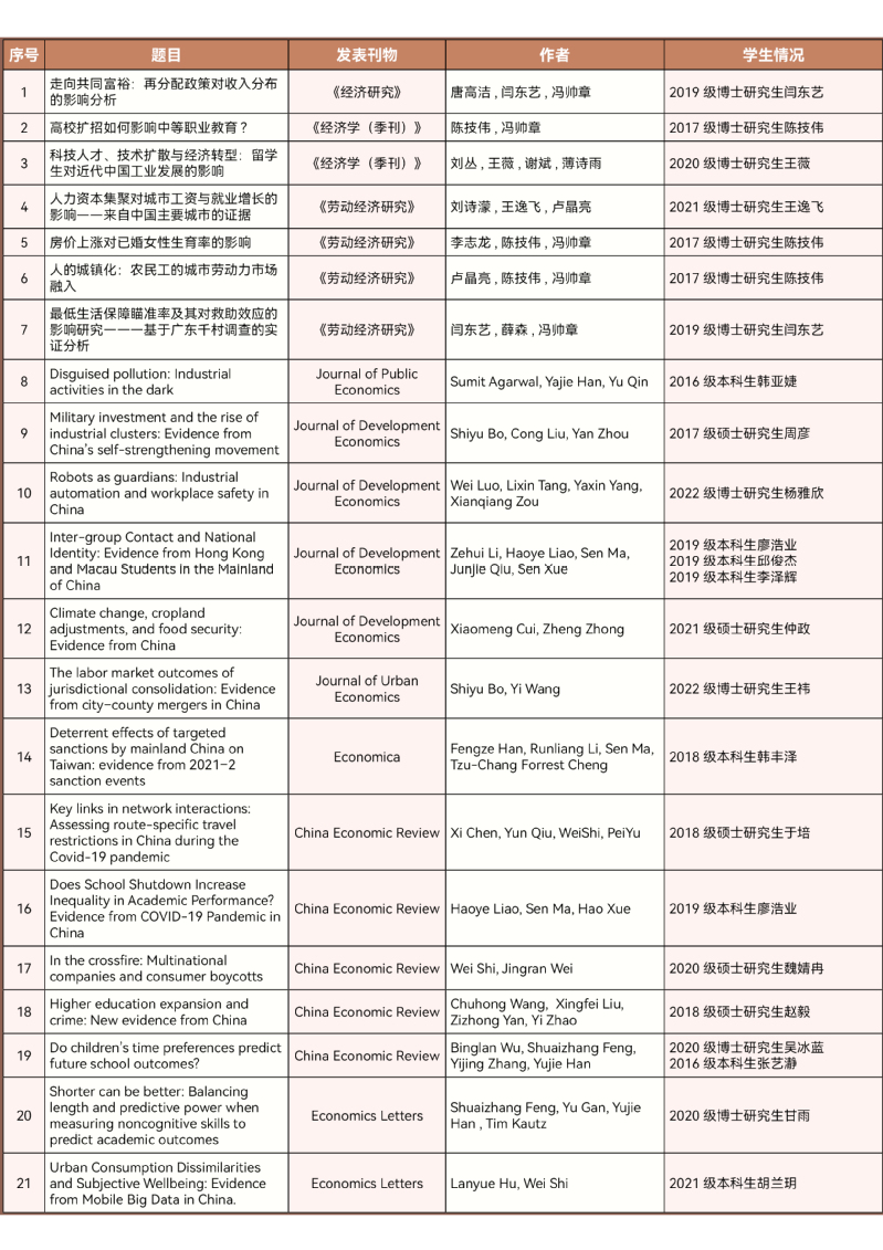 在科研育人方面,IESR同样贯彻“交叉融合”的理念,从成立之初的经济学(国际化创新班),到2023年春季学期启动的“新文科经济学拔尖人才计划”,IESR的教学体系始终是“经济+”模式,从经济学原理到计算机科学,从统计学到社会心理学,从课堂到社会实践,研究院致力于培养的是文理兼容的复合型人才。经过全面而扎实的科研训练,学生们有兴趣、有信心、更有能力对各个领域的问题开展研究,充分体现在近年来研究院科研育人成果斐然,目前已有20余篇师生合作论文发表于Journal of Public Economics、Journal of Development Economics、 Journal of Urban Economics、《经济研究》、《经济学(季刊)》等国内外权威经济学期刊。