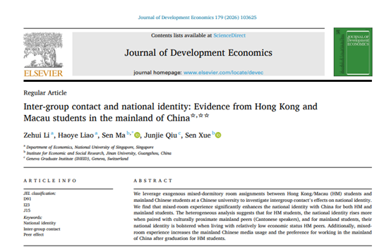2025年,研究院薛森副教授、马森副教授携手研究院2019级本科生李泽辉、廖浩业、邱俊杰合作完成的论文“Inter-group Contact and National Identity: Evidence from Hong Kong and Macau Students in the Mainland of China”正式在发展经济学国际顶级期刊Journal of Development Economics线上发表。这项研究聚焦暨南大学的侨校特色,以混合宿舍为独特切入点,通过三轮纵向追踪调查,系统揭示了港澳与内地学生群体间日常接触对国家认同的影响机制,不仅为学术界填补了“群体间接触对国家认同因果影响”的研究空白,更为高校跨群体融合、国家认同培育及粤港澳大湾区人才协同发展提供了扎实的实证参考。
