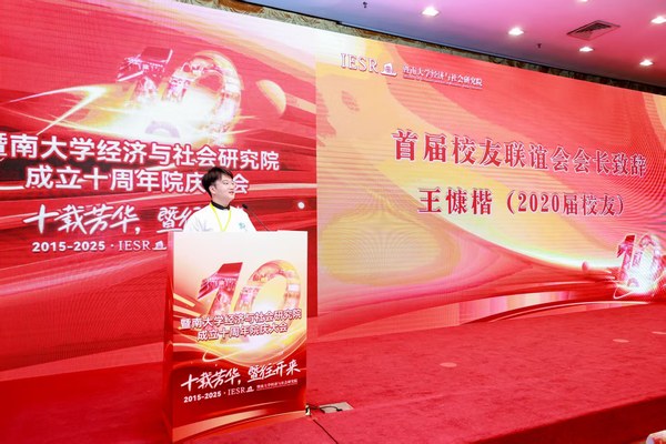 首届校友联谊会会长、2020届校友王慷楷将在IESR的三年比作一份珍贵的“礼物”。他表示,这份礼物中既包含“独自面对问题、探索解决方案”的勇气,也蕴含“携手同行、相互鼓励”的信任与热情。他希望校友联谊会能够成为一个有温度、有活力的家,不仅是连接过往的纽带,更是携手共赴未来的平台。