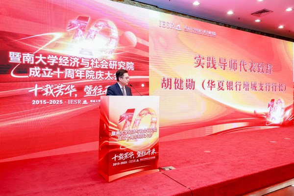华夏银行增城支行行长胡健勋对暨南大学经济与社会研究院十周年院庆表示热烈祝贺。作为首批实践导师之一,他表示这既是一份“被需要的责任感”,更是作为“同行者的理解与共鸣”。他期待能以自身行业经验陪伴学生成长,帮助年轻学子在探索中找准属于自己的发展道路。