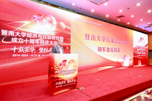 暨南大学校友总会会长胡军教授对经济与社会研究院十年来的发展成果表示高度肯定。他指出,这些成绩的取得,离不开广大校友始终如一的关心与支持。校友既是研究院办学成果的集中体现,也是连接学院与社会的重要桥梁。胡军教授希望研究院校友会继续广泛联络各界校友,凝聚情感共识,加强资源协作,共同谋划事业发展。