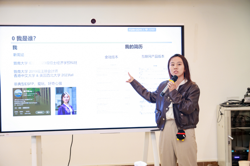 2023届海外硕士预备课程学生、现任互联网产品经理的靳周涵,以“我的职业选择与尝试”为题,分享了她跨越审计、金融与互联网三大领域的多元探索历程与最终抉择。靳周涵的分享生动展现了一位青年学子在多重可能性中逐步聚焦、理性决策的成长路径,为面临职业选择的同学提供了参考。