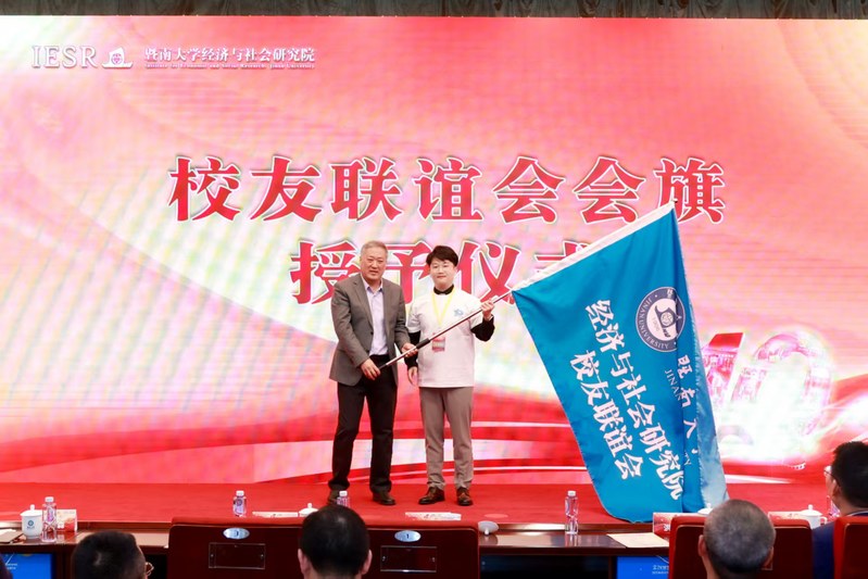 暨南大学校友总会会长胡军教授为我院校友联谊会授旗